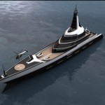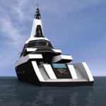 Per un’imbarcazione simile non basterebbe un intero libro per descriverne le caratteristiche, che al momento semplicemente non esistono, poiché si tratta di un disegno e poco più. Ad ogni modo, si tratta di un progetto originale, e monumentale, con uno scafo degno della lunghezza di una portaerei, completo di piattaforma per elicottero, un baglio massimo stretto in modo da dare allo scafo una linea filante per tutta la sua lunghezza, colori tra bianco, nero e teak, di un’eleganza per nulla scontata e una torre di comando titanica, che si erge come un albero maestro di acciaio e vetro, che ad occhio a croce dovrebbe essere alta una trentina di metri. Il sovracoperta è in teak, su due ponti più sotto nella sezione di poppa, rispetto allo spazio dedicato all’atterraggio dell’elicottero, mentre a prua i ponti sono a sbalzo terrazzati, come nelle navi da crociera.