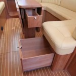 Per quanto riguarda l’abilitabilità a bordo, il piano di sottocoperta è disponibile in tre layout differenti. Uno comprende una versione con una zona carteggio, compresa di tavolo ripiegabile, e cucina a “L”, per un totale di 3 cabine, un altro propone invece della zona carteggio un salotto con divani e cucina sistemata lungo la murata, sempre con 3 cabine, mentre una terza si differenzia dalla prima per la disposizione delle cuccette, con una zona più ampia dedicata all’armatore ottenuta dall’eliminazione di una cabina, per un totale di 2.
